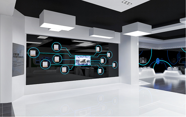 由于投影機存在亮度受環境光干擾嚴重、 燈泡易老化損耗等間題,所以在展示設計中在互動多媒體展項的設計上,我們盡可能的選取液晶屏來替代投影機。 如下圖,液晶屏的選取不需要預留投影設備空間,也無需擔心參觀者走動時形成光影干擾,同時畫質細膩。