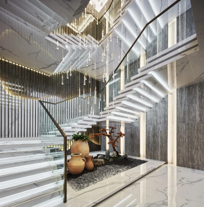 一層綜合展示區以及實景樣間,在呈現產品多樣性的同時,也讓客戶對于產品有所見即所得的購買體驗。設計師沙龍區將設計區與紅酒吧融入結合,讓設計師能更輕松愉快地交流、洽談。兒童娛樂區配備泡泡池,并以水刀切割工藝拼貼的卡通圖案作為裝飾背景,讓帶小孩的客戶能安心地體驗購物。通過光影與造型處理,精致、設計感十足的樓梯空間連著一層與夾層,讓客人有更上一層樓的探索欲望。