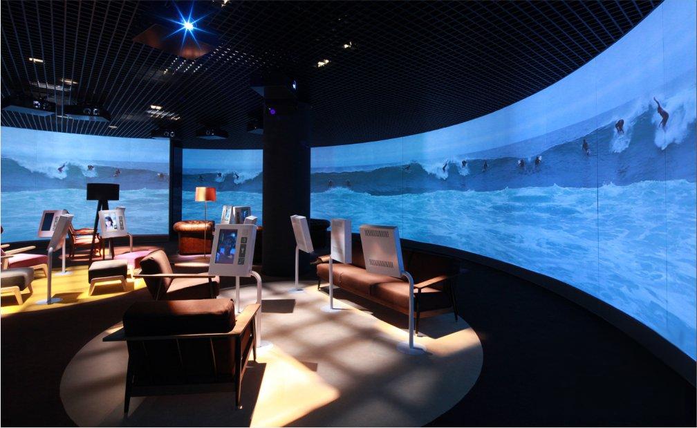 120°-360°環幕影院不同于一般的電影屏幕,環幕影院采用柱面投影屏幕 ,將觀賞者圍繞在中心。超長跨度的廣闊畫面充滿觀賞者的視野,全方位立體聲與影片情節相輔相成。柱面投影屏幕的弧度有360度、270度、180度等多種選擇,可根據場地具體情況進行個性化設計和施工,保證環幕影最佳的視聽效果。