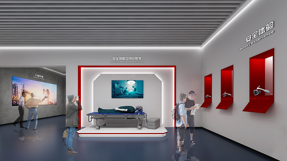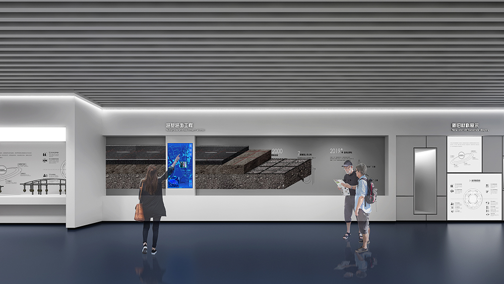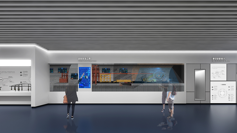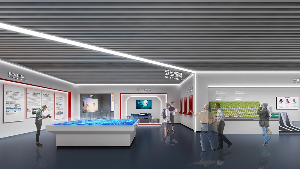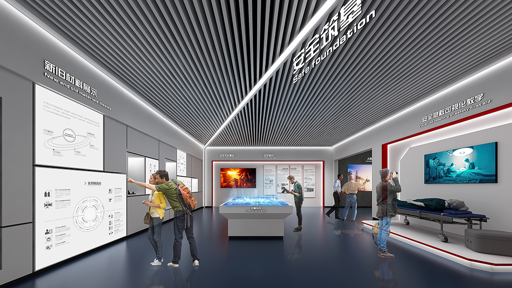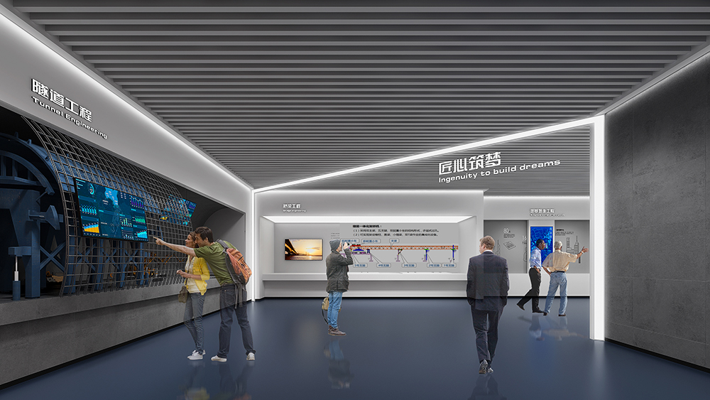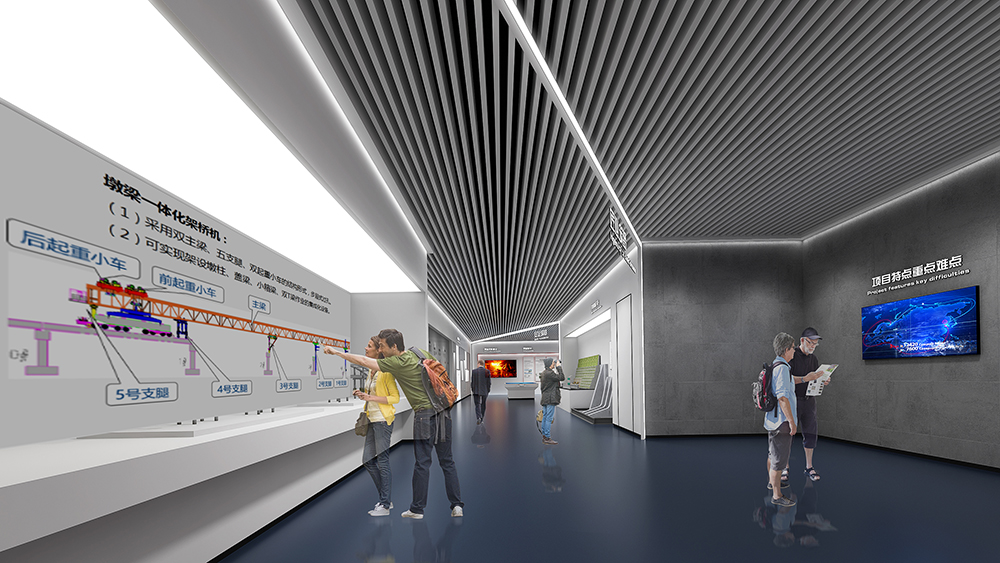 中鐵十四局深汕西改擴建展廳為深汕西改擴建9標展廳,該標段橋隧、路面工程量大,機械化程度高,須投入大量先進智能機械設備;隧道地質條件復雜,安全風險大,隧道斷面大,圍巖條件差,水文地質條件復雜,存在不良地質,施工安全風險大;路面施工安全風險高,路面施工要在不中斷交通的情況下進行,安全風險較高。在策劃設計時以中鐵十四局的“爭先尚干、不畏艱難、搏擊進取、永不言敗”航海精神為指引,乘風破浪,始終奮戰在條件最艱苦、人民最需要的地方。展廳從黨建融合、匠心筑夢、安全筑基、凝心聚力四大板塊內容,結合多內體互動技術,完美呈現了修舊如新,修舊超新的建設理念。